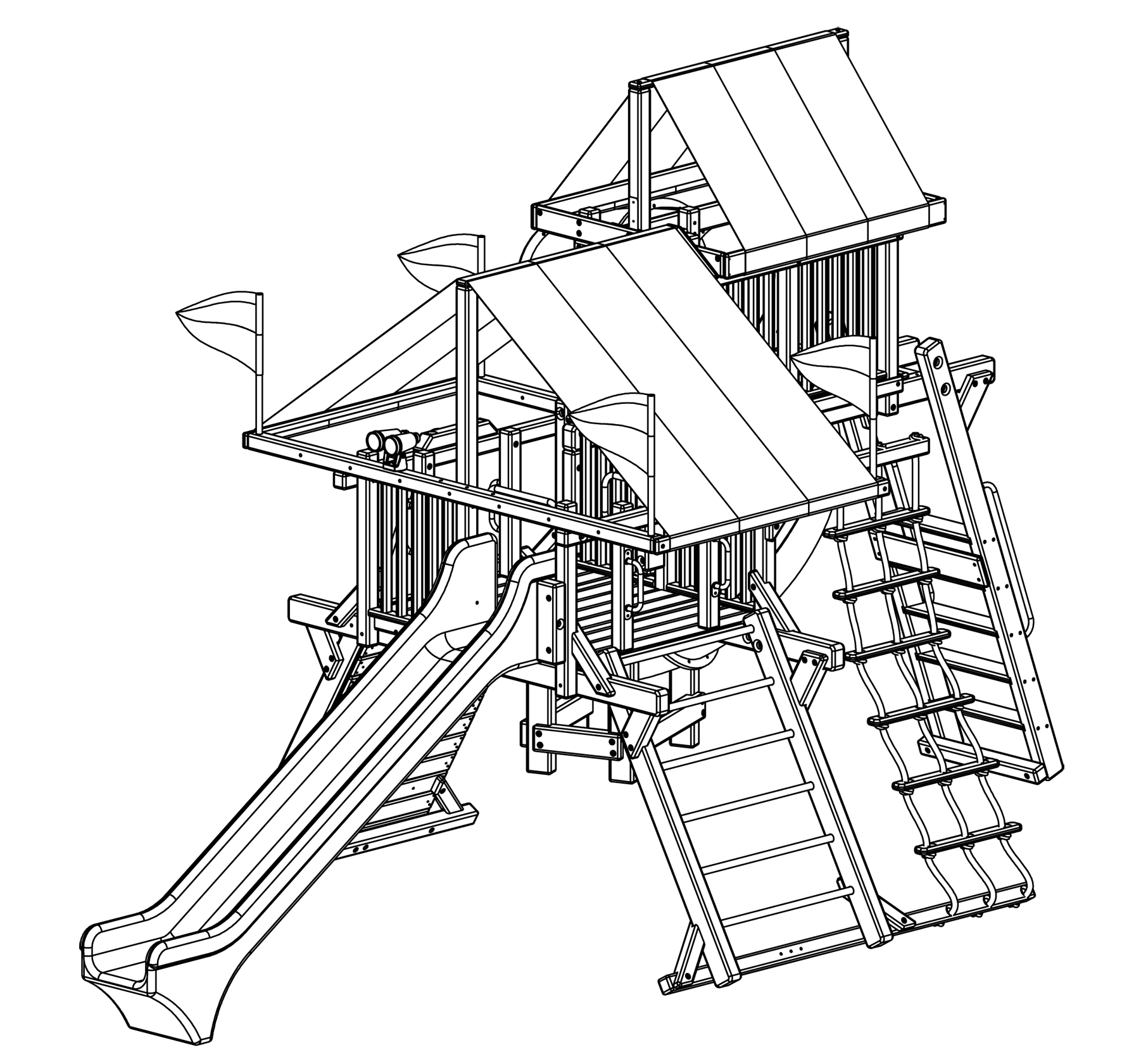 - Pack 4: struttura base con scivolo, postazione due altalene, la monkey bar + penthouse